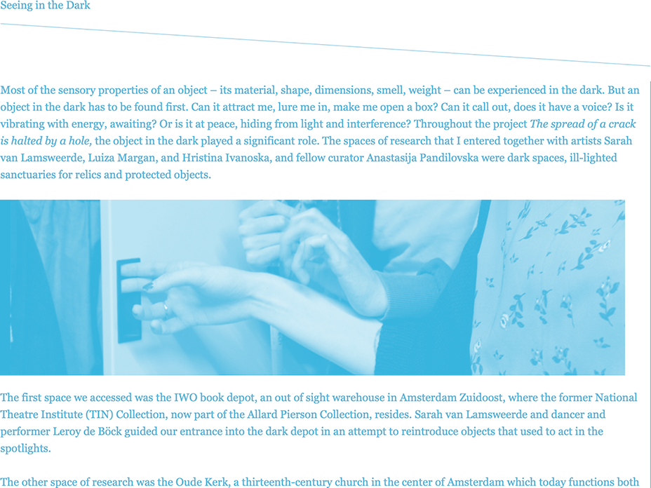 The spread of a crack is halted by a hole is a residency and research period developed in the social, cultural and physical space of the Oude Kerk by Hristina Ivanoska and Luiza Margan, and of the IWO boekendepot by Sarah van Lamsweerde. These artists gathered, and worked in M4gastatelier.